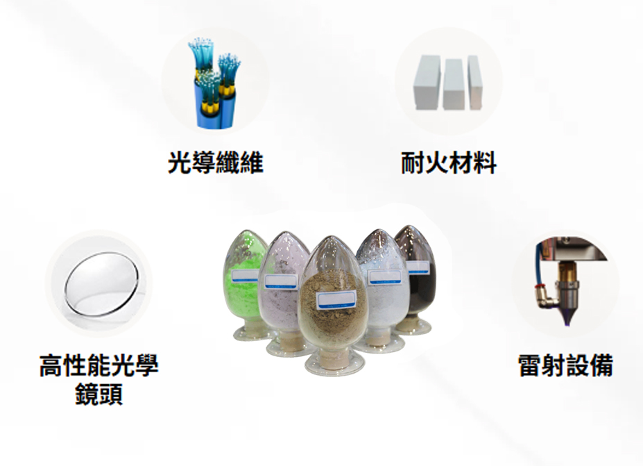 稀土拋光粉、稀土金屬、稀土澄清劑、汽車尾氣淨化劑、玻璃脫色劑、玻璃和陶瓷著色劑、石油裂化催化劑、三基色熒光粉、精密光學玻璃、光導纖維,以及應用於化工、冶金、輕紡、農業等領域。